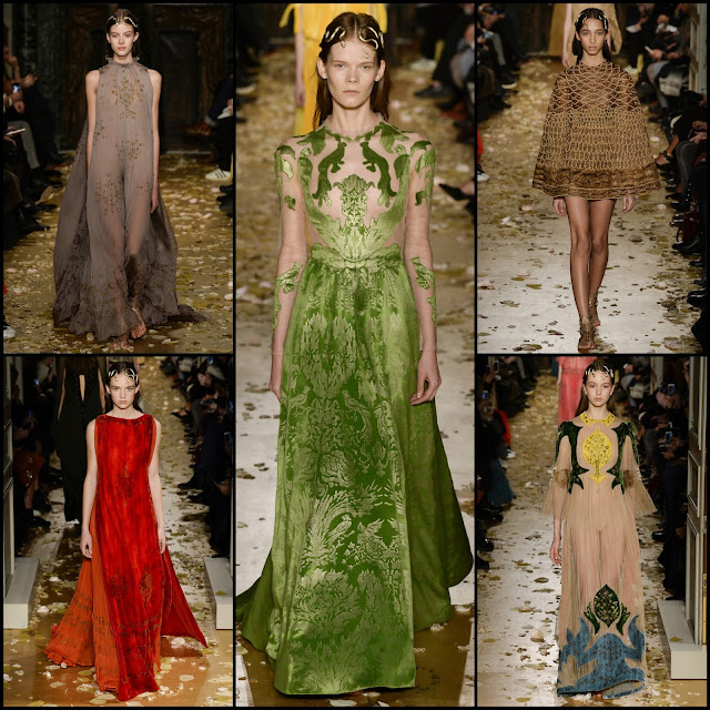 WHAT: Valentino Haute Couture Spring/Summer 2016. Valentino designers Maria Grazia Chiuri and Pierpaolo Piccioli used nymphs, Isadora Duncan, expressionist dancing, early 20th century Venetian-pagan romanticism as muses and themes for this very beautiful collection. The collection featured hand-done devore velvet appliques, delicate gold leaf embroidery, silk gauze and many looks reminiscent of a Couture Turandot opera--or a very Haute expressionist dance party!